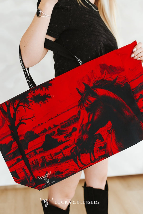Oversized Red Western Horse Scene Tote Bag, a stunning accessory designed for cowgirls who love vibrant style and functional design. This tote features a striking red and black ranch landscape with a powerful, beautifully illustrated horse as the focal point. The deep contrast gives it a dramatic, artistic look that stands out from traditional Western totes