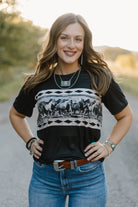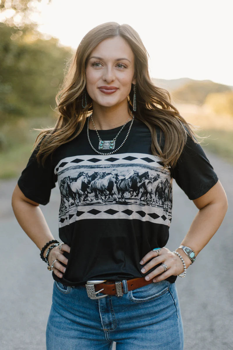 Embrace dynamic style with the Remuda Rush Top, featuring a striking design of a herd of horses in full run accented by subtle buck stitching. This black top brings energy and movement to your wardrobe, perfect for those who appreciate bold, western-inspired fashion with a refined touch.