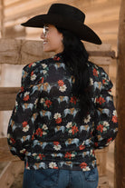 Add a touch of whimsy to your wardrobe with the Roan In Bloom Top. This black long-sleeve features charming bubble sleeves adorned with delicate poinsettia flowers and striking blue roan horses, blending floral elegance with equestrian flair. Perfect for playful days and stylish nights, it’s a unique piece that brings nature and spirit together in one delightful design.