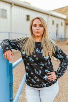 Saddle up in authentic Western style with this striking black long sleeve tee that captures the spirit of rodeo season. Featuring an eye-catching all-over print of bucking broncos, cowgirls, cattle, and Western crowns in vibrant turquoise and white, this tee delivers bold personality with every wear. Crafted from soft, breathable stretch-knit fabric, it offers the comfort you need for all-day wear without sacrificing impact. The relaxed fit and classic crew neckline make it endlessly versatile—layer it under your favorite shacket, pair it with distressed denim and boots, or wear it solo as a statement piece. Perfect for fall rodeo season and beyond, this is the Western essential your wardrobe has been waiting for.