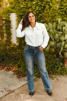 Elevate your denim lineup with our Stone Wash MID Rise Bootcut Jeans. Designed for both style and comfort, these jeans feature a flattering mid-rise fit that enhances the waist and elongates the legs. The premium stretch denim sculpts the body while allowing flexibility for all-day wear—perfect for rodeo days or everyday adventures. The standout feature? Intricate cowboy hat embroidery detailing on the back pockets adds a distinctive Western flair, complemented by bold contrast stitching and authentic fading throughout the front thighs and seat. The bootcut silhouette flares slightly at the hem, designed to pair seamlessly with your customers’ favorite cowgirl boots.