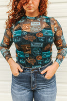 Elevate your Fall  Western wardrobe with the Turquoise Collage Western Printed Long Sleeve Mesh Top from Lucky & Blessed. This sheer mesh top combines vintage rodeo posters, cowboy motifs, and rustic typography in a vibrant palette of turquoise, red, brown, and cream, creating a striking patchwork effect. Its sophisticated design blends nostalgia with contemporary style, perfect for making a confident statement at any event. The lightweight fabric offers comfortable wear while showcasing your unique Western flair with elegance and boldness.
