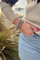 Simple, classic, and western at heart. The Pearl Desert Bracelet features a single strand of smooth silver-toned beads that add effortless shine to any stack. Lightweight, easy to wear, and perfect for pairing with cuffs, conchos, or your everyday favorites.