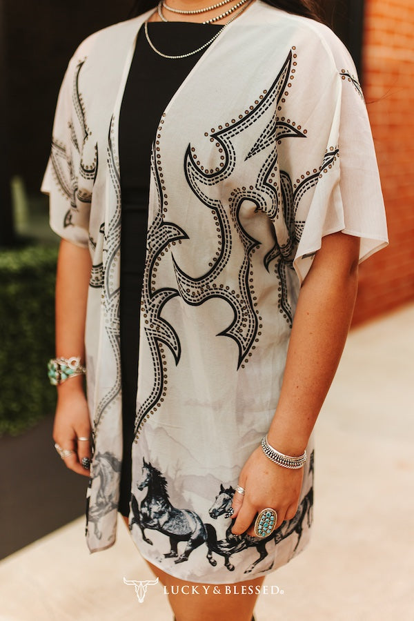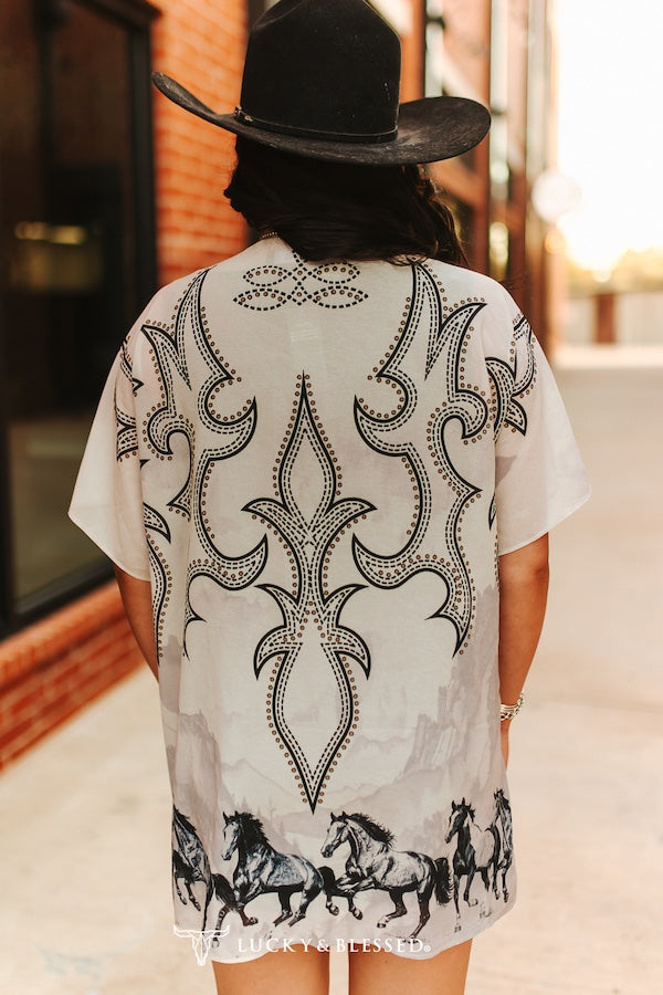 Ivory Western Cowboy Hat Printed Long Sleeve Mesh Top