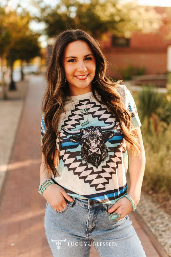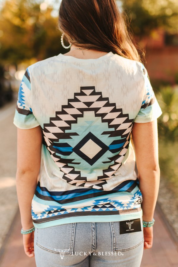 Cream Boot Teal Aztec Printed Short Sleeve Top