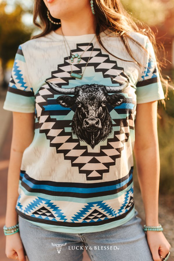 Ivory Turquioise Bull Aztec Printed Short Sleeve Shirt