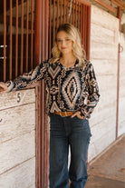 Elevate your wardrobe with the Ashwood Trail Top, featuring a sleek black base accented by a striking gray, cream, and black Aztec pattern. This long sleeve design balances bold style with versatile comfort, making it perfect for layering or wearing on its own. Crafted to complement any look, it brings an eye-catching detail that sets you apart effortlessly.
