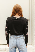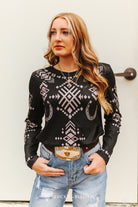 Make a bold statement this Fall with our Black Aztec Horseshoe Long Sleeve Top — a stunning fusion of Western charm and modern edge.. Crafted in a soft and stretchy performance knit fabric, it hugs the body for a flattering silhouette while offering supreme comfort for everyday wear. The full-length sleeves feature matching tribal-inspired patterns running down to the wrist, while the front and back present clean lines that make this a standout layering piece under shackets, denim vests, or fringe jackets.