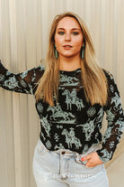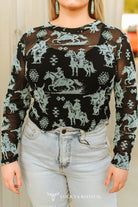 Make a bold statement this fall with our sheer long sleeve mesh top, adorned with a vibrant turquoise vintage rodeo print. Featuring cowgirl riders, wild broncs, and rustic geometric designs on a breathable black mesh, it stretches for a flattering fit. Lightweight and unlined, this playful top is perfect for layering over bralettes or pairing with high-rise jeans and concho belts. Embrace modern style with a nostalgic Western twist—ideal for rodeo season, market days, and country concerts.