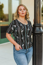 Elevate your wardrobe with this Black Turquoise Jewelry Concho Printed Top, featuring a flattering V neckline and comfortable short sleeves. The intricate concho-inspired print adds a refined touch, while the lightweight fabric ensures ease of wear throughout the day. Perfect for sophisticated casual looks or layering under a blazer for a polished finish.