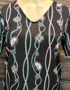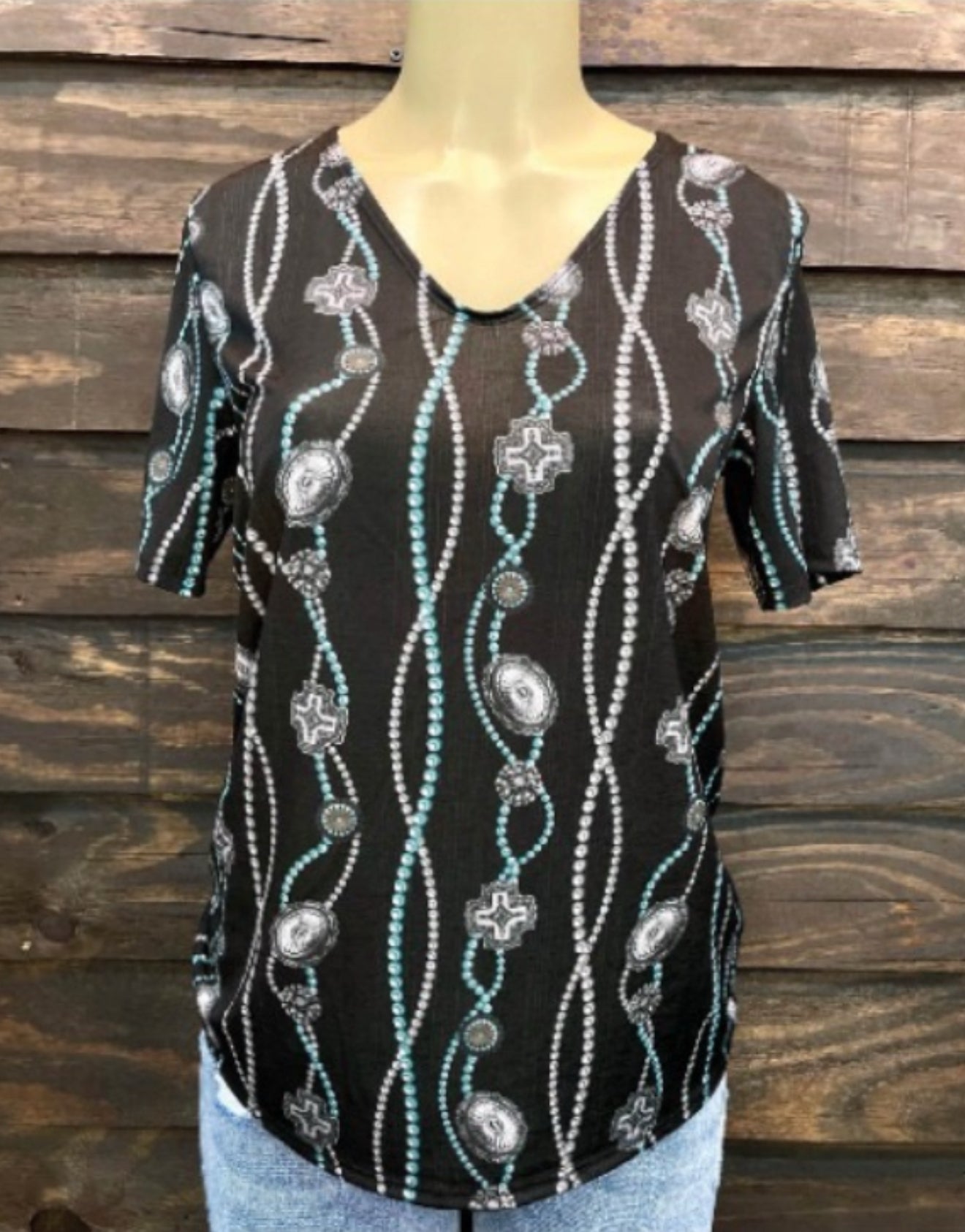 Black Turquoise Jewelry Concho Printed V Neckline Short Sleeve Top