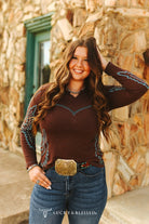 Elevate your Western style with the L&B Boot Stitch Brown long sleeve tee. Featuring bold turquoise embroidery and classic boot-stitch motifs, this soft and stretchy top hugs your body for a flattering silhouette. Perfect for layering or pairing with rodeo-ready jeans and concho belts. Notch neckline and contrast stitching add an extra touch of femininity.