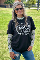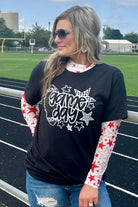 Get ready to cheer in style with this playful black tee featuring "Game Day" text, a bold leopard-print football, and stars. Perfect for showing your team spirit with a fun, fashionable twist. Comfortable and eye-catching, it’s your new go-to for every game day celebration.