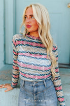 Elevate your wardrobe with this sophisticated Multicolor Aztec Mesh Long Sleeve Top. Crafted from lightweight stretch mesh, its fitted silhouette and high crew neckline offer a flattering, breathable fit. The vibrant geometric Aztec print in turquoise, gray, soft pink, ivory, and charcoal adds a bold yet refined touch. Perfect as a standout piece or layered under denim vests and embroidered jackets, it seamlessly transitions from rodeo weekends to everyday wear, making it an essential addition for the fall and transitional seasons.