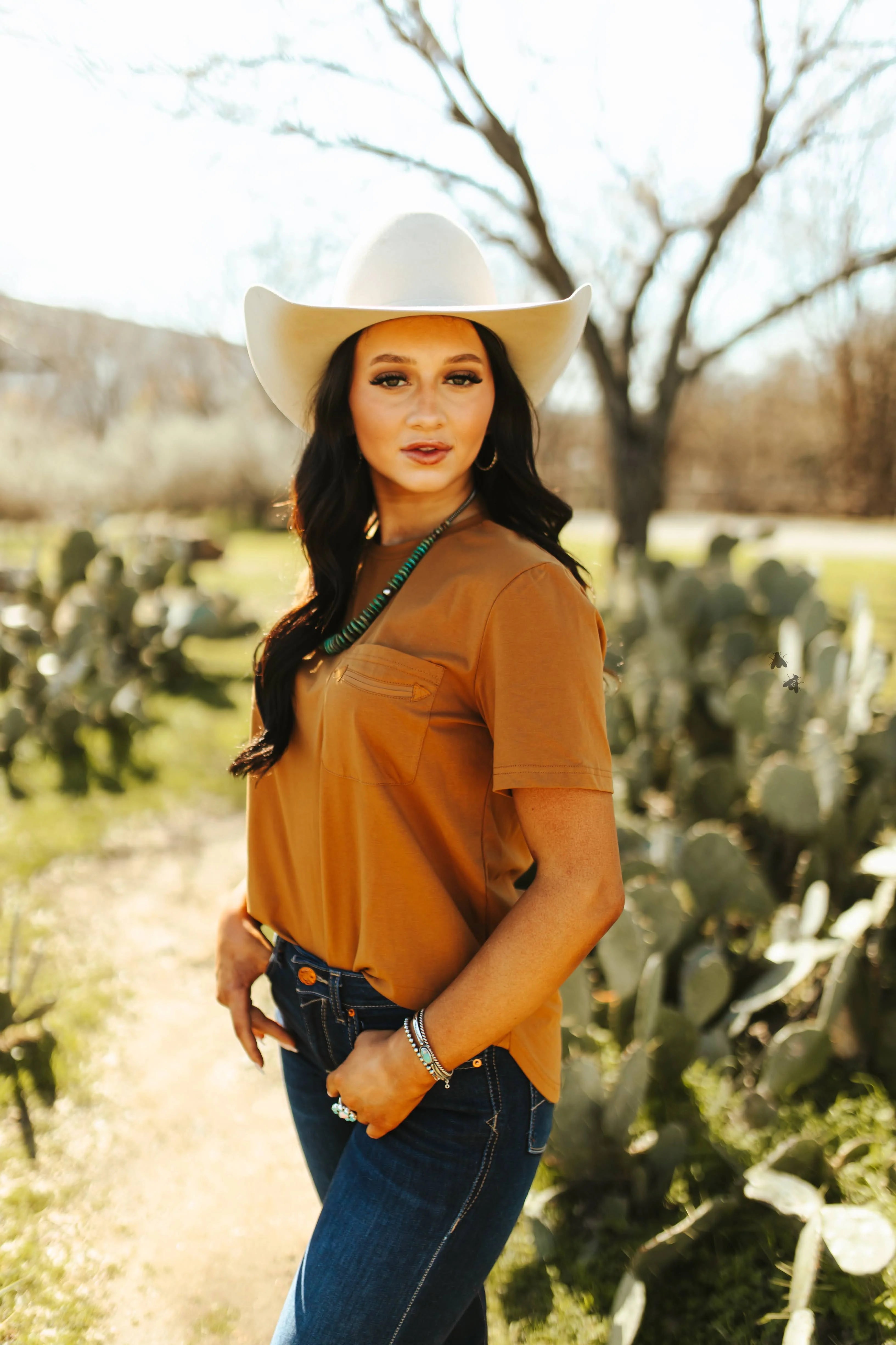 Introducing our Handy as a pocket tee in buckskin color! This tee features a convenient pocket adorned with a stylish western arrow. Stay organized and on-trend with this must-have addition to your wardrobe.