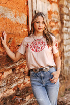Embrace your western roots in this soft pink short-sleeve stretch top featuring a bold cowboy silhouette framed by a circular Aztec pattern in deep red. The lightweight, ultra-soft fabric ensures all-day comfort, while the round neckline and relaxed fit make it easy to wear for any occasion. Aztec accents on the sleeves add a touch of western flair, giving this tee a unique and eye-catching design. Whether you're heading to a rodeo or just showing off your cowgirl style, this top is a must-have for your western wardrobe.