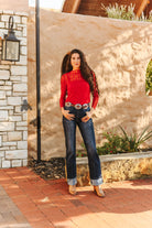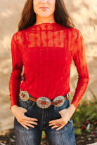 This is a Western-inspired white mesh top featuring a unique cactus and arrow embroidered pattern. It comes with a matching tank liner, providing stylish coverage while maintaining the chic, sheer look. The long sleeves and high neckline add a touch of elegance, making it perfect for layering with turquoise jewelry and pairing with denim for a trendy, Southwestern vibe. A must-have for adding a subtle Western flair to any outfit!