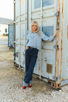 This denim top exudes rustic charm balanced with a feminine edge, making it a versatile addition to your wardrobe. Perfect for layering, it can be worn solo or paired effortlessly with turquoise or silver accessories for a refined southwestern-inspired look. A beloved style from spring returns for fall and winter, offering timeless appeal for cooler seasons.