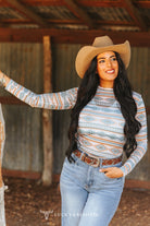 This top is a fitted long-sleeve mesh beauty featuring a soft pastel Aztec print with tones of light blue, rust orange, and cream. The lightweight, sheer material gives it a breathable, second-skin feel—perfect for layering or wearing on its own. It’s styled with high-waisted jeans and a tooled leather belt for a classic Western touch, and finished with a wide-brim cowboy hat for that true ranch-ready look. This top blends comfort, color, and cowgirl sass effortlessly.