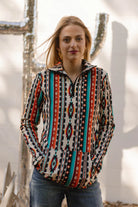 Brighten your day with the Sunburst Stampede Pullover, featuring lively Aztec patterns and bold stripes in turquoise, orange, and a burst of fun colors. This playful pullover adds a splash of energy to any outfit while keeping you cozy and stylish. Perfect for those who love a pop of vibrant flair in their wardrobe!