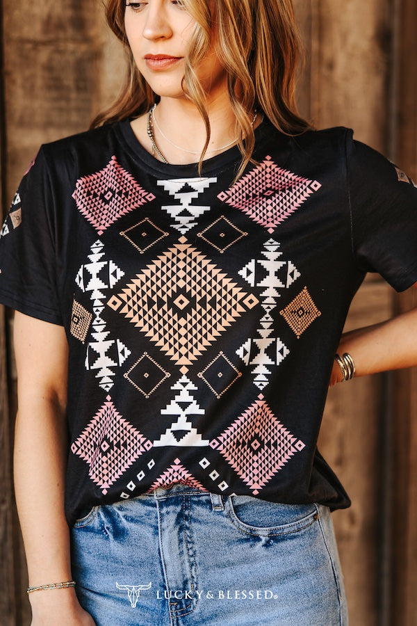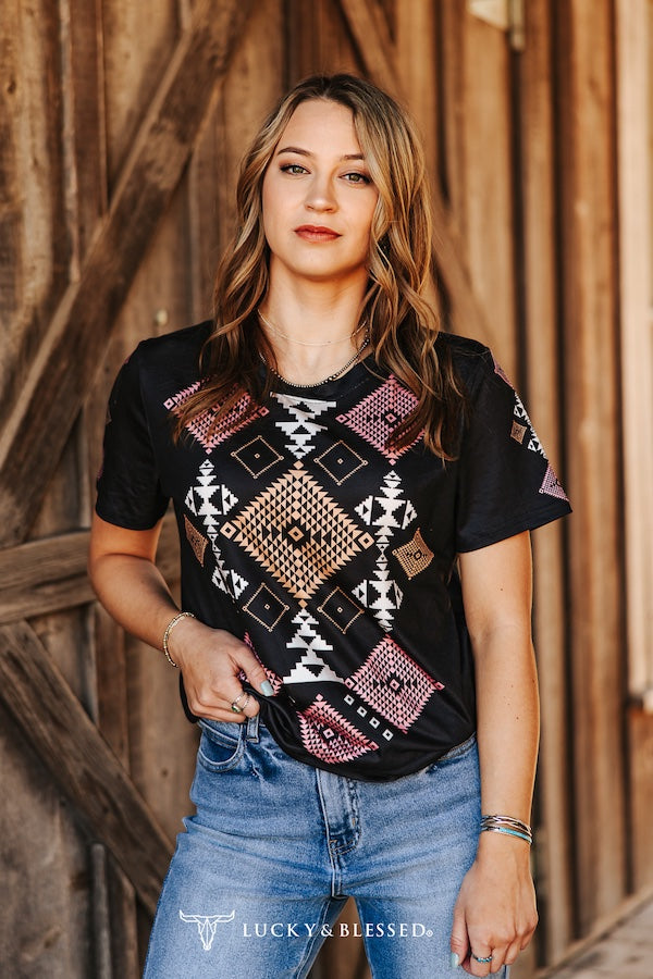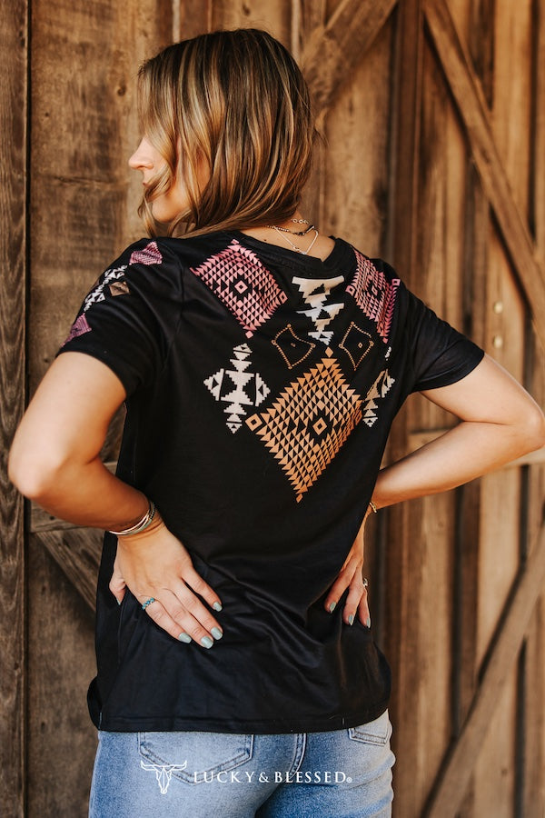 Black Coral Aztec Printed Short Sleeve Top