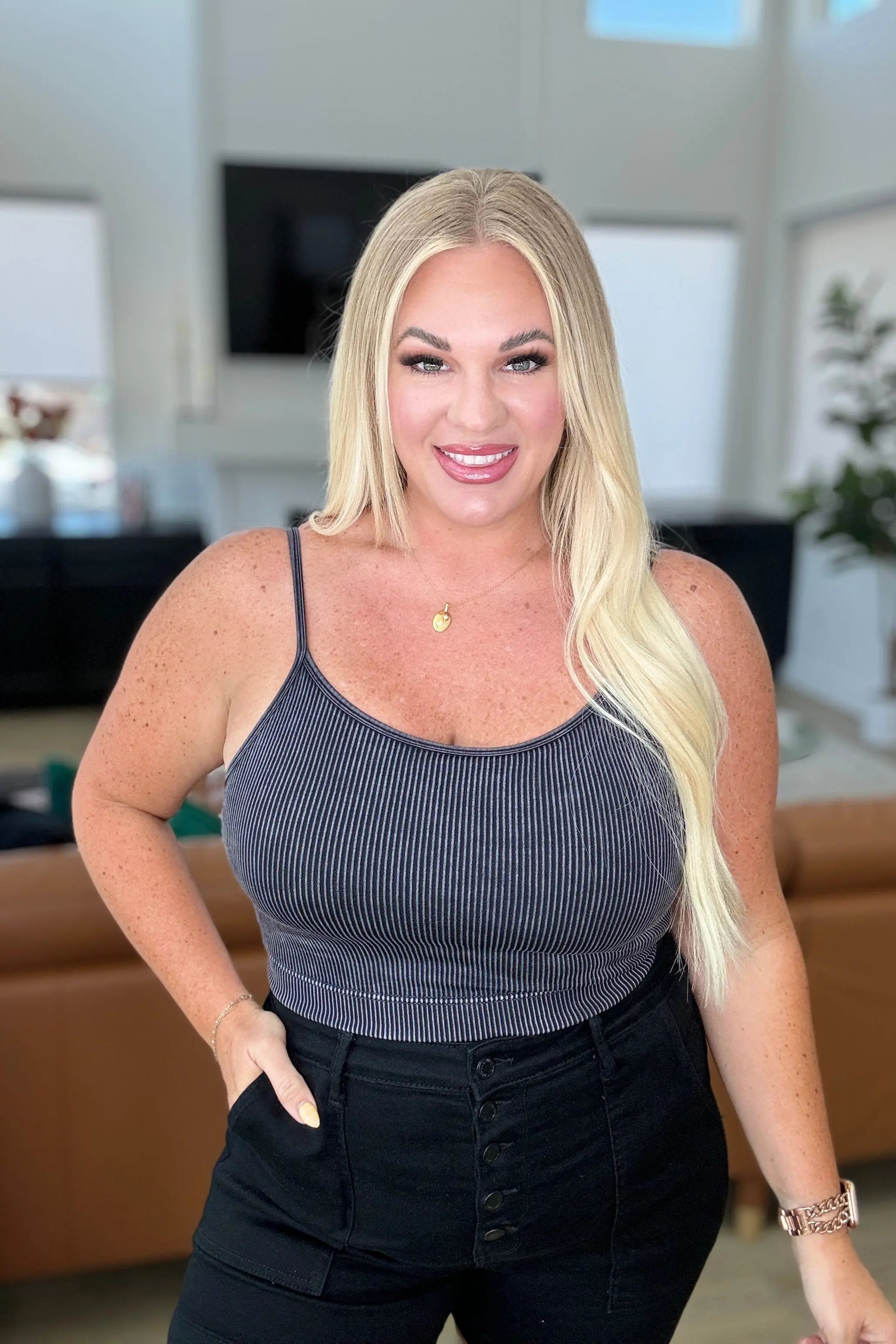 Introducing the At Last Ribbed Tank, the perfect blend of comfort and style. Made with soft ribbed knit fabric, this tank features a round neckline and removable cups for a versatile look. With adjustable straps, you can customize the fit to your liking.