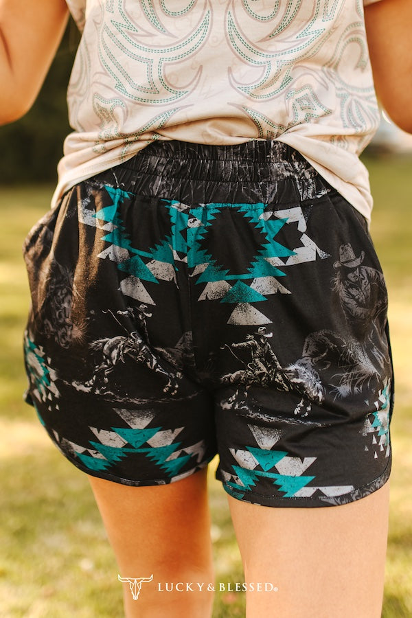 Embrace your bold western spirit with these eye-catching shorts featuring an authentic Southwestern Aztec pattern mixed with classic cowboy and rodeo imagery. The elastic waistband and relaxed fit deliver all-day comfort, whether you're heading to a festival, outdoor gathering, or just keeping it casual. Striking turquoise, black, and neutral tones make a statement that pairs perfectly with graphic tees, tanks, or western-inspired tops. Lightweight and breathable fabric keeps you cool and comfortable in warm weather. This is the standout piece your wardrobe has been waiting for.
