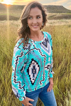 Brighten your wardrobe with the Blue Ridge Top, featuring a vibrant turquoise base adorned with a chic gray, black, and white Aztec pattern. Crafted from a fresh, must-have fabric, this top combines comfort with eye-catching style, perfect for adding a playful pop to any outfit.