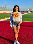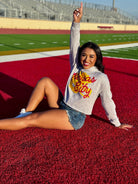 Shown on a Next Level heather grey cropped hooded sweatshirt.