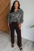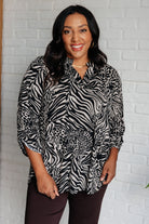 Transform your closet with the Lizzy Top in Black and Taupe Animal Print. Made from Bulgari, this top features a gabby neckline and rolled sleeves with button tabs for a comfortable, yet eye-catching piece. The 3/4 length sleeve and scoop hem add flow to the already stylish piece. Experience comfort and style in one with the Lizzy Top.