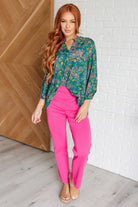 Transform your closet with the Lizzy Top in Teal and Purple Floral Paisley. Made from Bulgari, this top features a gabby neckline and button rolled sleeve tabs for a comfortable, yet eye-turning piece. The 3/4 sleeve and scoop hem add flow to the already stylish piece. Experience comfort and style in one with the Lizzy Top.