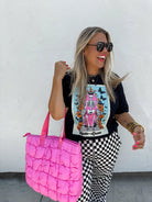 This high quality bag features the most trendy puffer/bubble style fabric. The perfect size to fit lots of things inside! Includes an inside pocket zipper with 2 smaller open pockets for cell phones and makeup. Bag also completely zips closed on top.