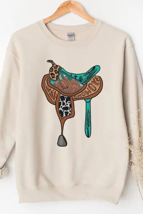Introducing the Saddle Howdy Sweatshirt – a luxurious layering piece that blends fashion-forward style with stellar comfort. Fleece lined for warmth and featuring a unisex fit, it's the perfect addition to any wardrobe, allowing you to make a statement without sacrificing comfort.