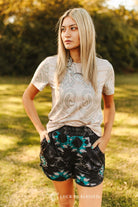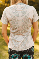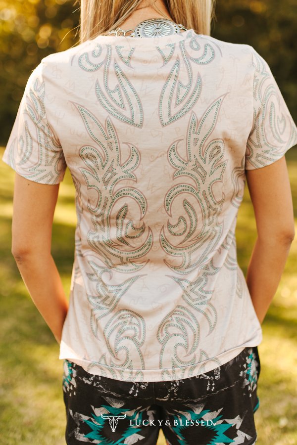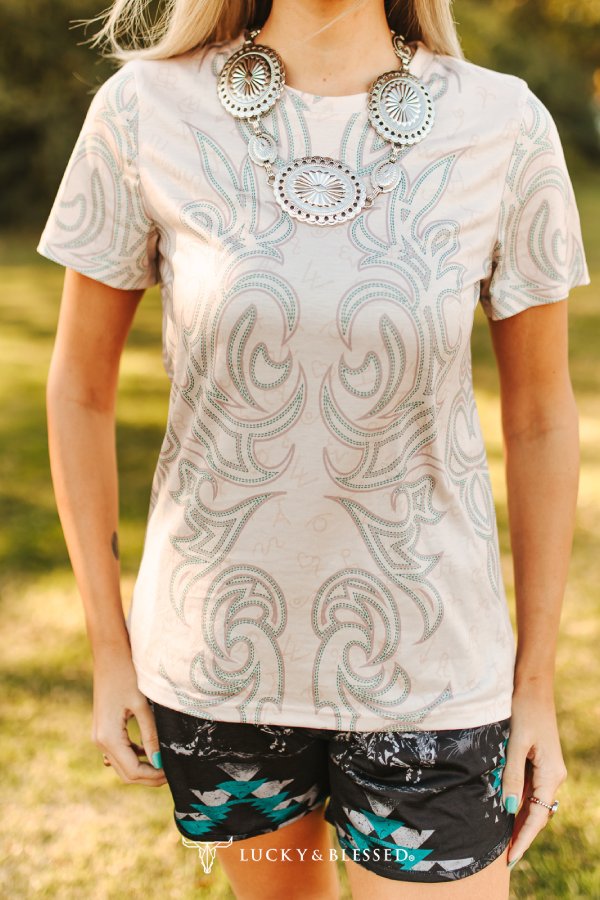 Embrace authentic western style with this Sand Boot Stitch Printed Short Sleeve Shirt. Featuring eye-catching teal and stone-colored boot-stitch graphics across the front and back, this lightweight tee delivers classic cowgirl charm with modern comfort. The relaxed fit and breathable fabric make it perfect for everyday wear, rodeo events, or NFR weekends. Pair it effortlessly with denim, rodeo shorts, or layer it under your favorite jacket for versatile ranch-ready looks that capture true western spirit.