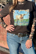 Show off your Texas pride with this playful black mesh top featuring a bold Longhorn design surrounded by delicate bluebonnets. Lightweight and breathable, it’s perfect for adding a touch of Lone Star State charm to any casual outfit. Whether you’re at a summer festival or just out with friends, this top brings a fun, fresh vibe to your wardrobe.
