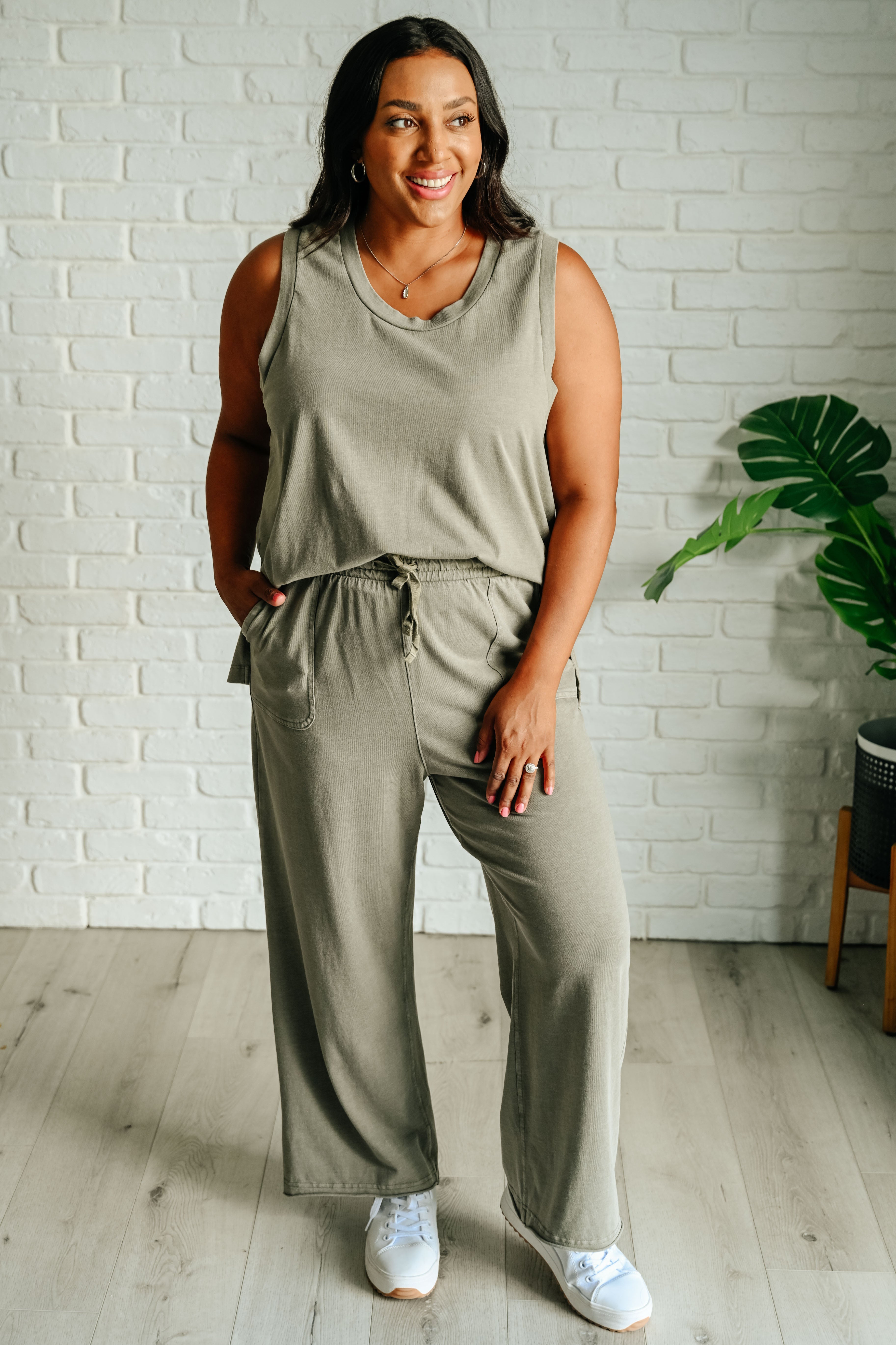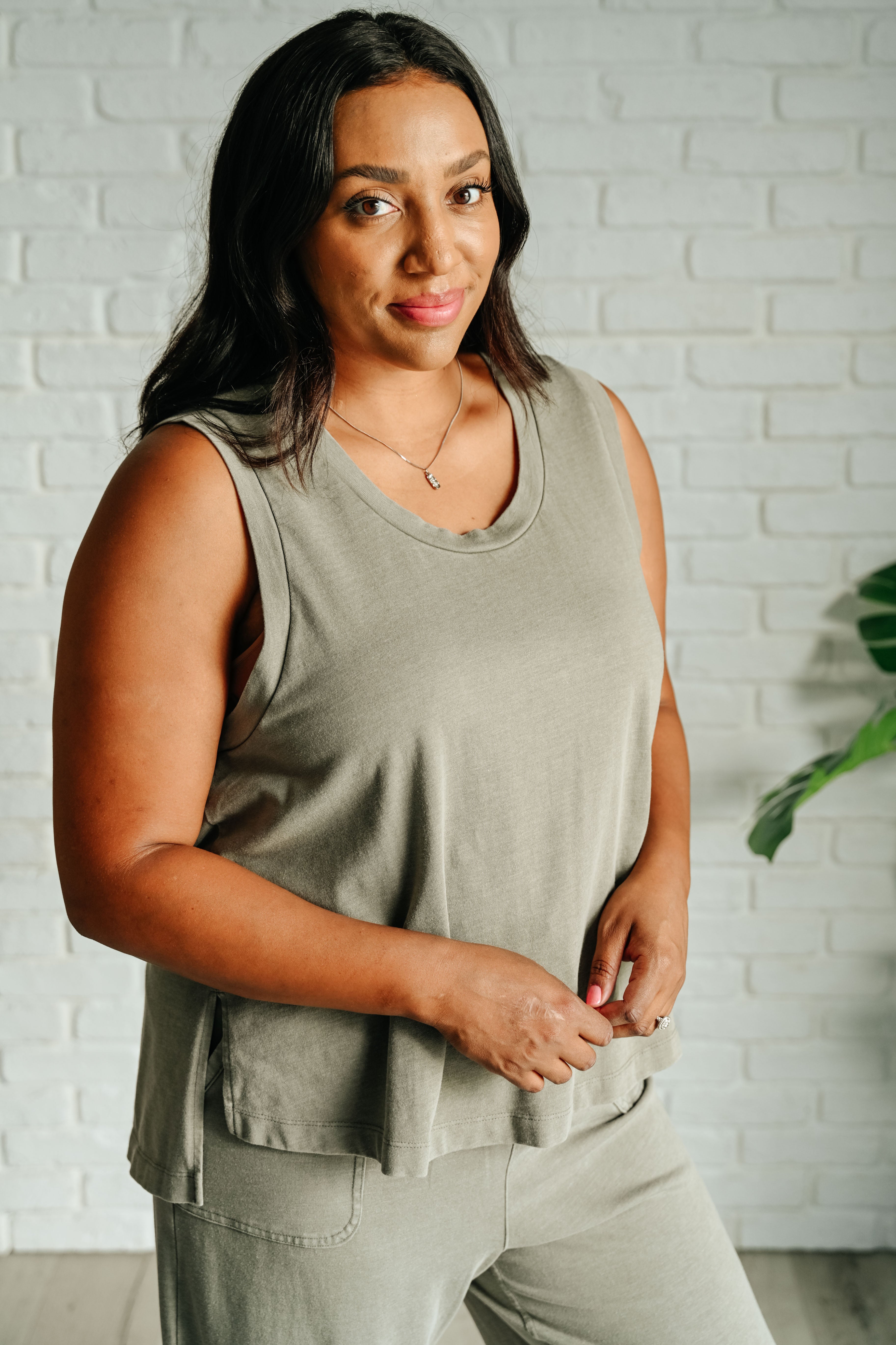 Relax in style with our Taking It Easy Tank and Pants Set. Made of soft and comfortable knit fabric, this set features a banded scoop neckline, banded armholes, and a stepped hem with side slits for ultimate comfort. The pants have a cased elastic waistband with a functional drawstring, side patch pockets, a straight leg silhouette, and raw hem details. Perfect for lounging or running errands, this set will become your new go-to for easy and effortless style.