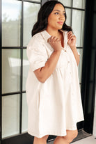 Get lost in poetic daydreams with our Tortured Poet Dress. This flirty cream-colored A-line dress features a collared neckline, functional button closures, and shoulder pleat details. Keep your essentials close with the front patch and functional side pockets. Finished with back pleats for added flair. Live out your literary fantasies in style on