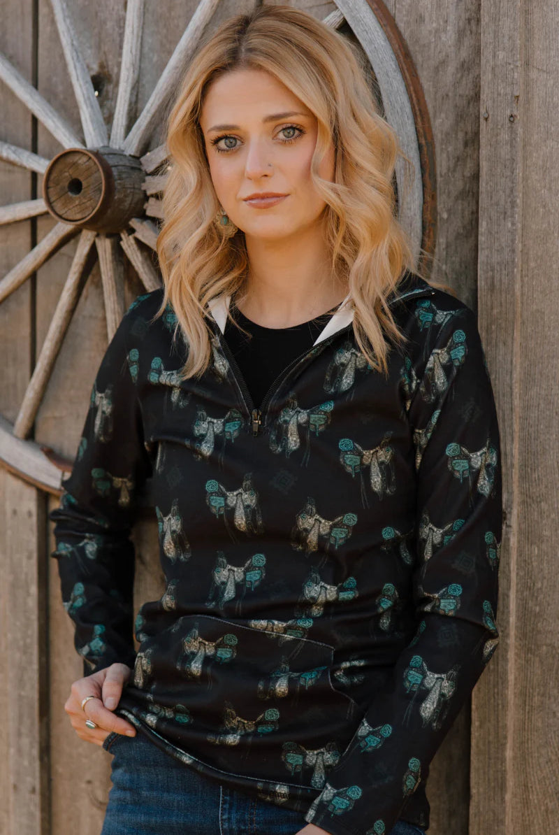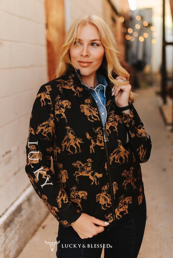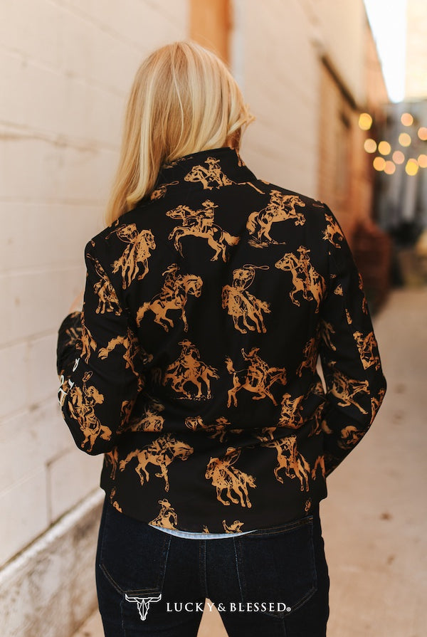 Experience the perfect blend of comfort and Western charm with the Rosette Rodeo Blanket. One side showcases a pink fabric decorated with cacti and bronc horses, while the other features a beautifully tooled leather panel highlighting a bronc horse and authentic brands. This dual-sided design offers warmth and rugged elegance, making it an ideal accessory to bring rodeo-inspired style and cozy comfort to any space.